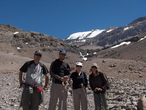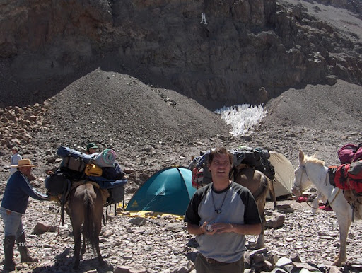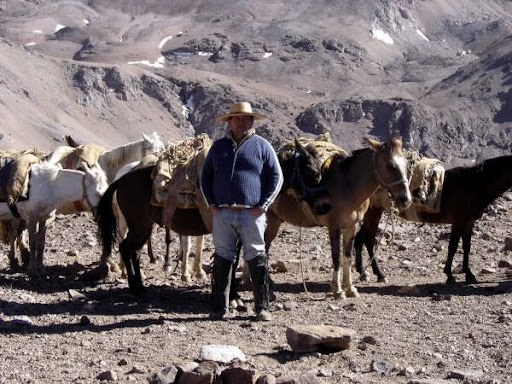 Los arrieros con las mulas comenzaron a llegar como a las 10 am. Les dejamos las cargas ordenadas y comenzamos la caminata de unos 8 kms. hasta el campamento base a 4.200 mts. de altura. Yo dejé para que se llevaran las mulas una mochila con parte de la ropa y comida, además del saco de dormir y de la carpa. Para el camino llevé una mochila más pequeña con dos botellas de líquido, chocolates, MyM y pasas con maní. También llevaba la cámara fotográfica, un polar y una parca, lo que no fue necesario usar.