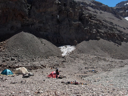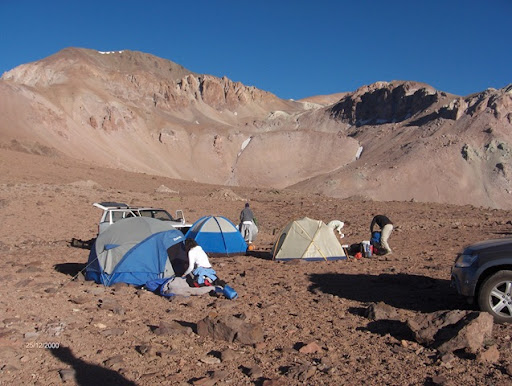Finalmente llegamos al lugar donde acamparíamos. Estábamos a 4.200 mts. de altura, cada movimiento pesaba, el oxígeno faltaba, pero todavía no teníamos ninguna víctima del apunamiento. Eran como las 5 pm. Debíamos levantar las carpas y comer para acostarnos temprano. Al día siguiente la despertada sería a las 3 am.