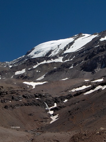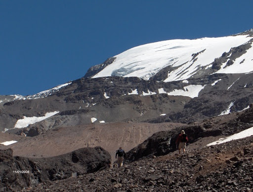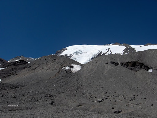 Hay una roca como a unos 30 mts. que indica el final de este pesado camino. De ahí, hay que cruzar un glaciar, que es más o menos plano y fácil, luego una subida pesada pero corta y ya estamos en un terreno plano (relativamente) que nos llevará sin dificultades a la cumbre. Estoy a no más de unos cincuenta metros de la cumbre (en altura, no en distancia). Ya casi lo logro. Sigo subiendo y antes de llegar al final del acarreo, me pongo a descansar y a esperar al Coke. En la espera llega Ignacio, un argentino que ya ha subido anteriormente este cerro, por lo que me cuenta cómo es el camino que queda por delante. El viene muy equipado. Tiene GPS, tiene grampones, que son convenientes para cruzar el glaciar. Tiene calma para dosificar sus energías. Nos quedamos conversando hasta que llega el Coke. Comemos chocolate y consumo los últimos sorbos de líquido. Una vez que Coke se siente descansado, proseguimos. Ya estamos casi al final del acarreo. Un esfuerzo adicional y listo.