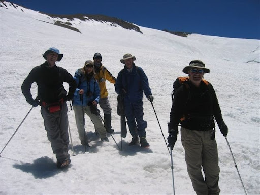 Una vez fuera de la carpa, me voy a presentar donde RAO, el jefe de la expedición, quien al verme, extrañado me mira y pregunta si pretendo ir con jeans para arriba. Contesto que sí, pero que también tenía un pantalón de esquí. "En ese caso póntelo, pues en caso contrario el viento te va a hacer recagar de frío". Obediente, no sin dificultad me pongo esta última prenda. En eso aparece Ricardo y su hijo, el Coke y alguien más, que están listos para partir y deseosos de emprender la marcha. Yo no estoy seguro de seguirlos a ellos. Esperemos al resto del grupo, me decía para adentro. Pero no, vamos! Y partimos!