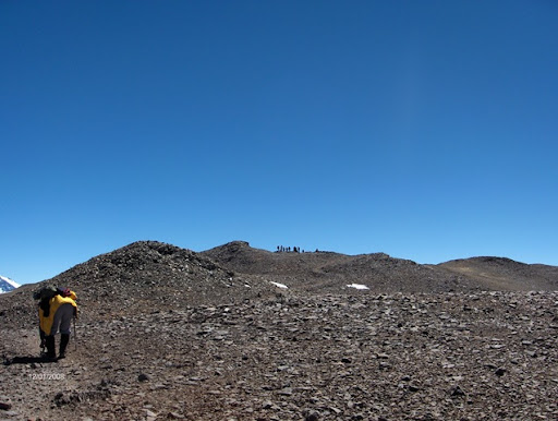 El ascenso seguía. Ya comenzaba a insinuarse el perfil de la montaña. Se empezaba a iluminar el universo. El grupo de mujeres me dejó. O yo las dejé. Continué a mi ritmo y en un momento me reencontré con el Coke, quien también prefirió un ritmo más calmado. Comenzábamos el ascenso por el "acarreo", un sendero bien inclinado de pura piedrecilla suelta que es interminable y que da la sensación de que no se avanza nada, pues cada vez que se pisa, el peso sobre estas piedras sueltas lo hacen a uno retroceder algo. Es como caminar en la arena, como subir una duna! "Si pasas el acarreo - me dijo Andrés Honorato en Santiago - seguro que llegas a la cumbre". Es un recorrido de unos 500 metros que a cada centímetro que se avanza, pareciera que alguien te está metiendo en la cabeza que no serás capaz de hacerlo, que no vale la pena continuar, que no tiene sentido hacer tan descomunal esfuerzo. Pero no. No me convencen todavía. Es cierto que estoy cansadísimo, pero noto que aún tengo energías, que las piernas me dan y el corazón está bien. Continúo entonces. Lento, descansando, dejando que otros me pasen. No hay apuros. El Coke está igual que yo. Tal vez comienza a flaquear un poco. Con frecuencia me pide que paremos a descansar. Lo acompaño, pero noto que las paradas no me hacen bien, pues pierdo el ritmo que tenía. En un momento le digo que yo seguiré y que lo espero más arriba. Comienzo mi caminata solo. Sigo subiendo y de pronto me encuentro con Paula, una de las maratonistas que está media apunada. Tiene dolor de cabeza. Le ofrezco una aspirina, ha tenido mareos y malestar estomacal. La acompaño por unos minutos hasta que decide continuar. Seguimos subiendo pero pronto se dará cuenta que no puede continuar. Decide bajar al campamento. Es lo mejor. No puede seguir subiendo y tampoco es conveniente que se quede en el camino. Hace frío, hay mucho viento.
