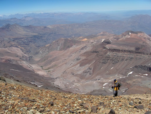 El descenso: Luego de una media de descanso, de comer algo y hasta dormitar un poco, iniciamos el descenso. Eran las 13 hrs. Llegar a la cumbre nos significó 8 hrs. de gran esfuerzo. Cuánto demoraríamos en bajar?