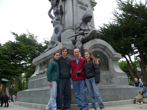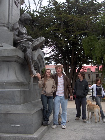 Al llegar al centro, nos dirigimos a una pizería bastante simpática y simple y luego nos fuimos al museo de los Braun Menéndez, casa que fue donada al fisco tal cual estuvo puesta mientras vivía la familia allí. De ahí nos fuimos a la plaza de Punta Arenas, donde está la estatua de Hernándo de Magallanes, junto a otros personajes y un indio, al que la tradición cuenta que si se le toca el pie, se vuelve a ese lugar en algún otro momento de la vida. Entonces fuimos a tocarle el pie al indiecito y finalmente las emprendimos a Puerto Natales.